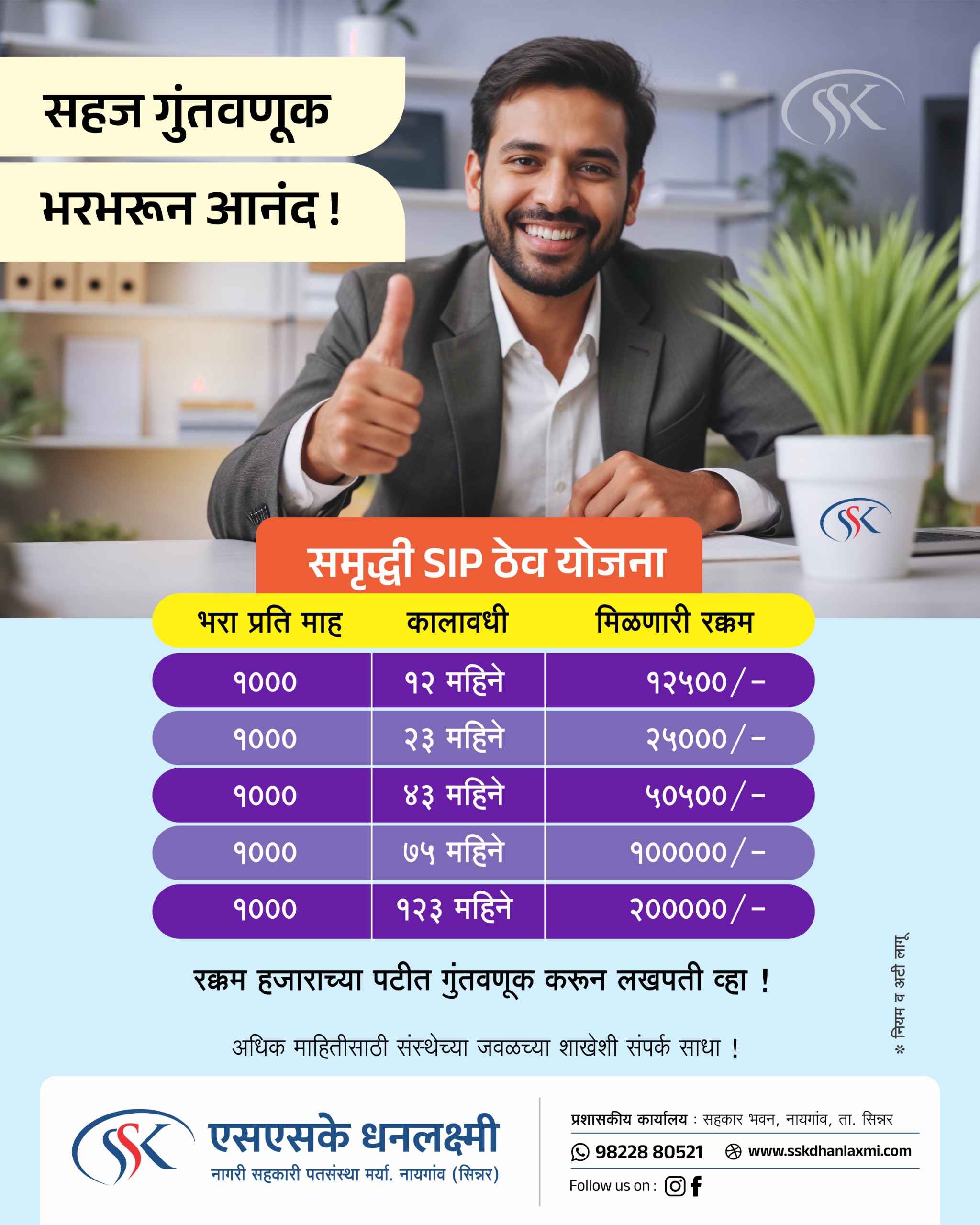 मी SSK धनलक्ष्मीमध्ये बचत खातं ठेवत आहे आणि त्यांच्या मुदत ठेवींवर (FD) उत्तम व्याजदर मिळतात. ग्राहक समाधानाला प्राधान्य देणारी आणि स्पष्ट आर्थिक सल्ला देणारी ही संस्था आहे. आमच्या परिसरात अत्यंत विश्वासार्ह!