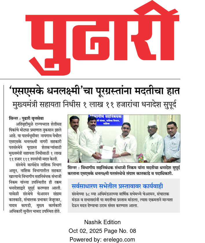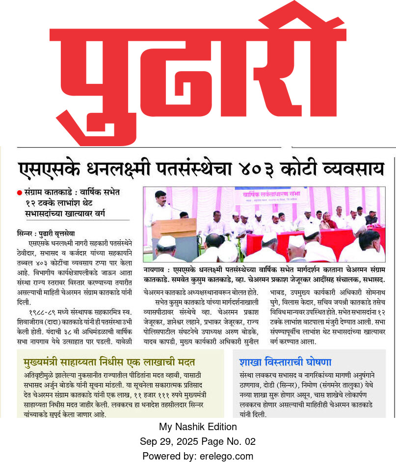 दै.पुढारी वृत्तपत्र सिन्नर तालुका सहकारी पतसंस्था फेडरेशन, ता. सिन्नर, जि. नाशिक येथे श्री.संग्रामभाऊ कातकाडे यांची अध्यक्ष पदी निवड झाल्याबद्दल अभिनंदन