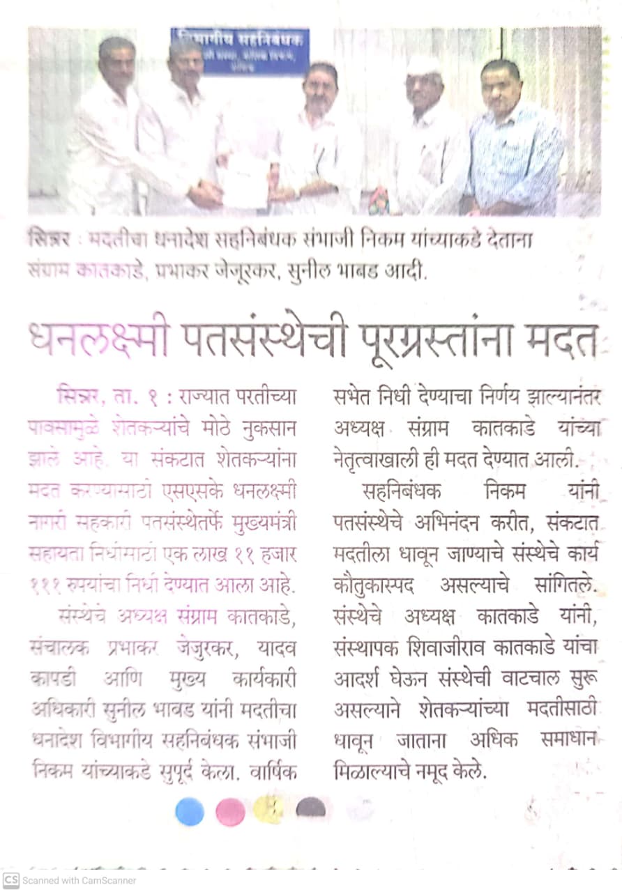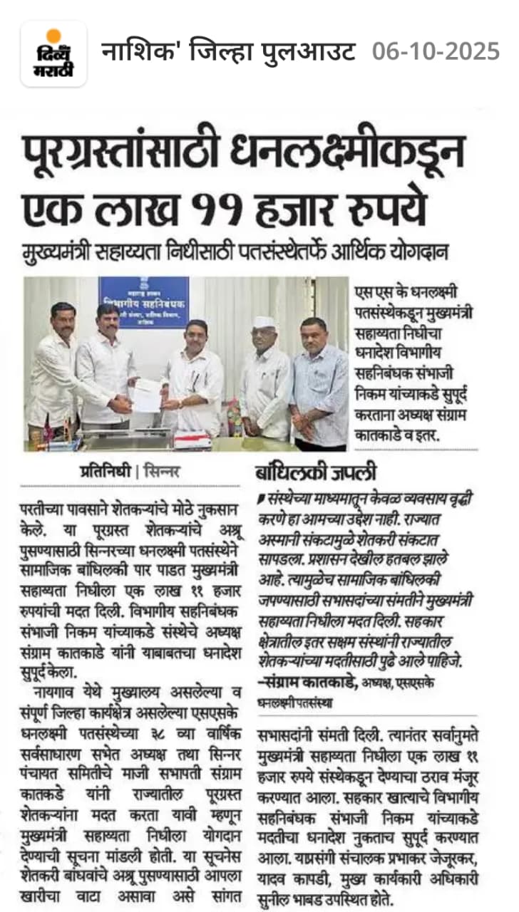 दै.सकाळ पूरग्रस्त शेतकऱ्यांसाठी मुख्य मंत्री सहाय्यता निधी रु. ११११११ ची मदत